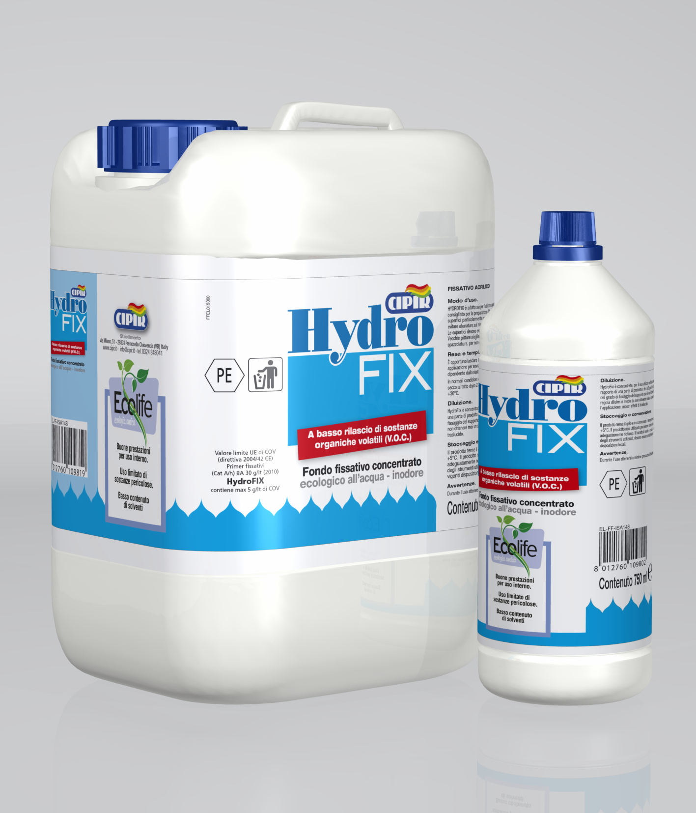 Ecological acrylic fixative for interiors, Ecolife. Odourless and very low release of volatile organic compounds (COV).