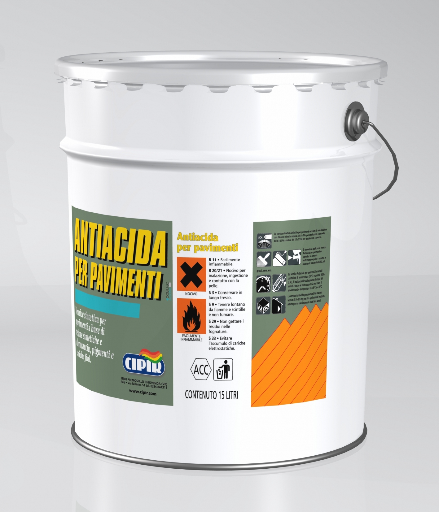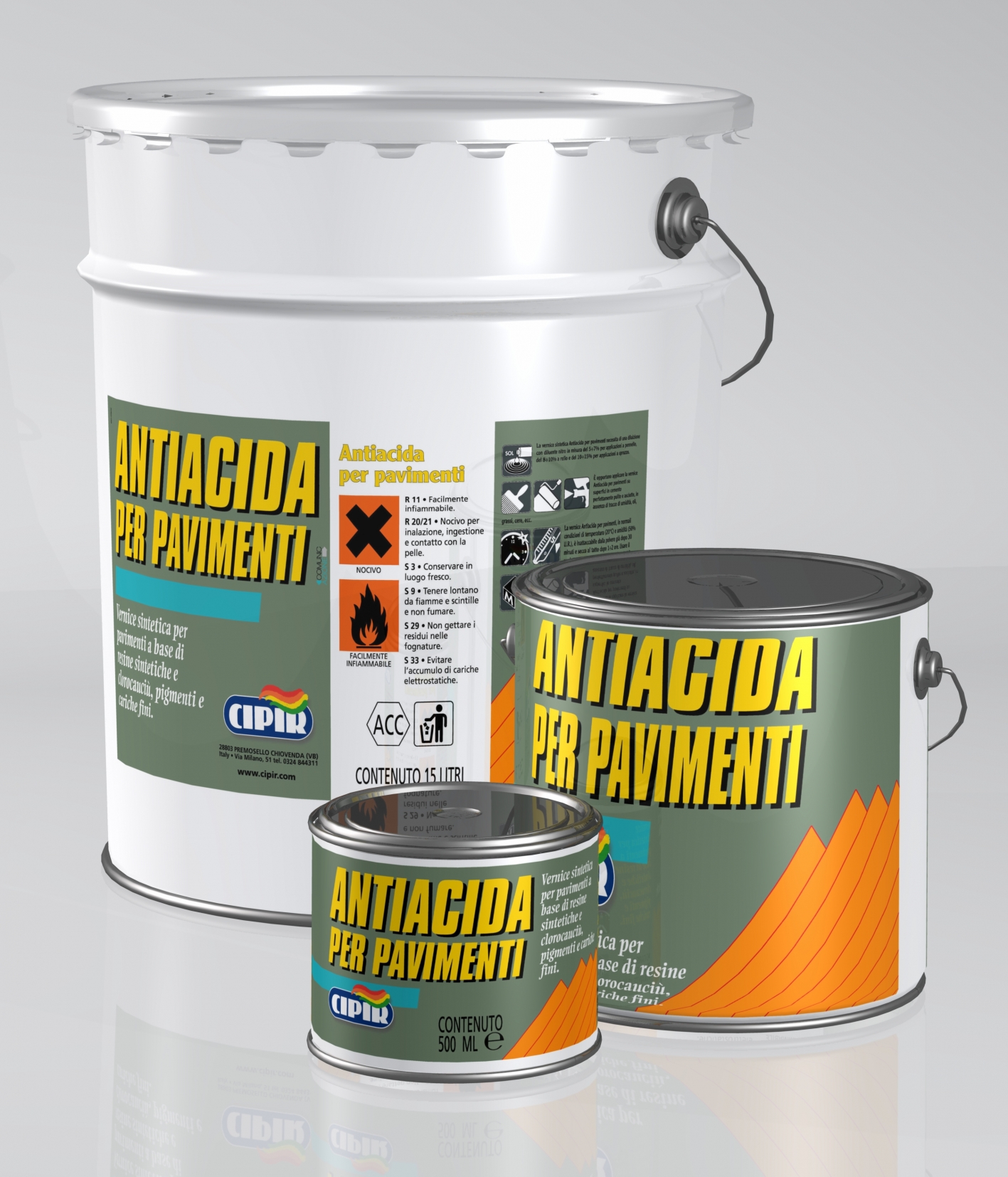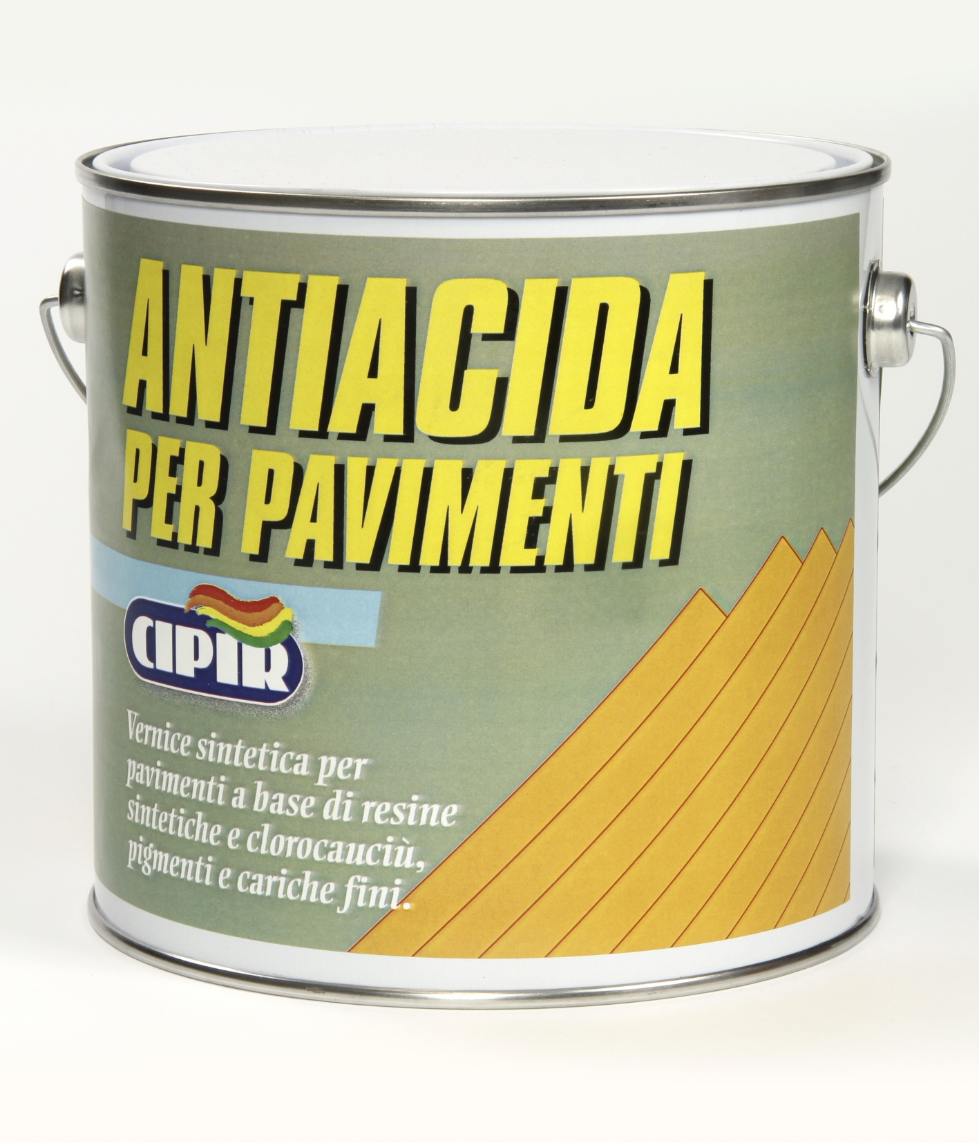 CICLO: Su pavimenti nuovi: il getto del cemento deve essere stagionato, dovranno essere trascorsi almeno 28 giorni dalla posa prima di poter applicare la "Antiacida per pavimenti. Assicurarsi che la superficie sia perfettamente asciutta, esente da tracce di oli, grassi ed impurità, nonché accuratamente spolverata. Procedere quindi alla stesura della prima mano di vernice, diluita con diluente nitro (circa 8÷10%). Trascorse almeno 24 ore, in normali condizioni atmosferiche (20°C e 60% U.R.), si potrà applicare la seconda mano di prodotto.