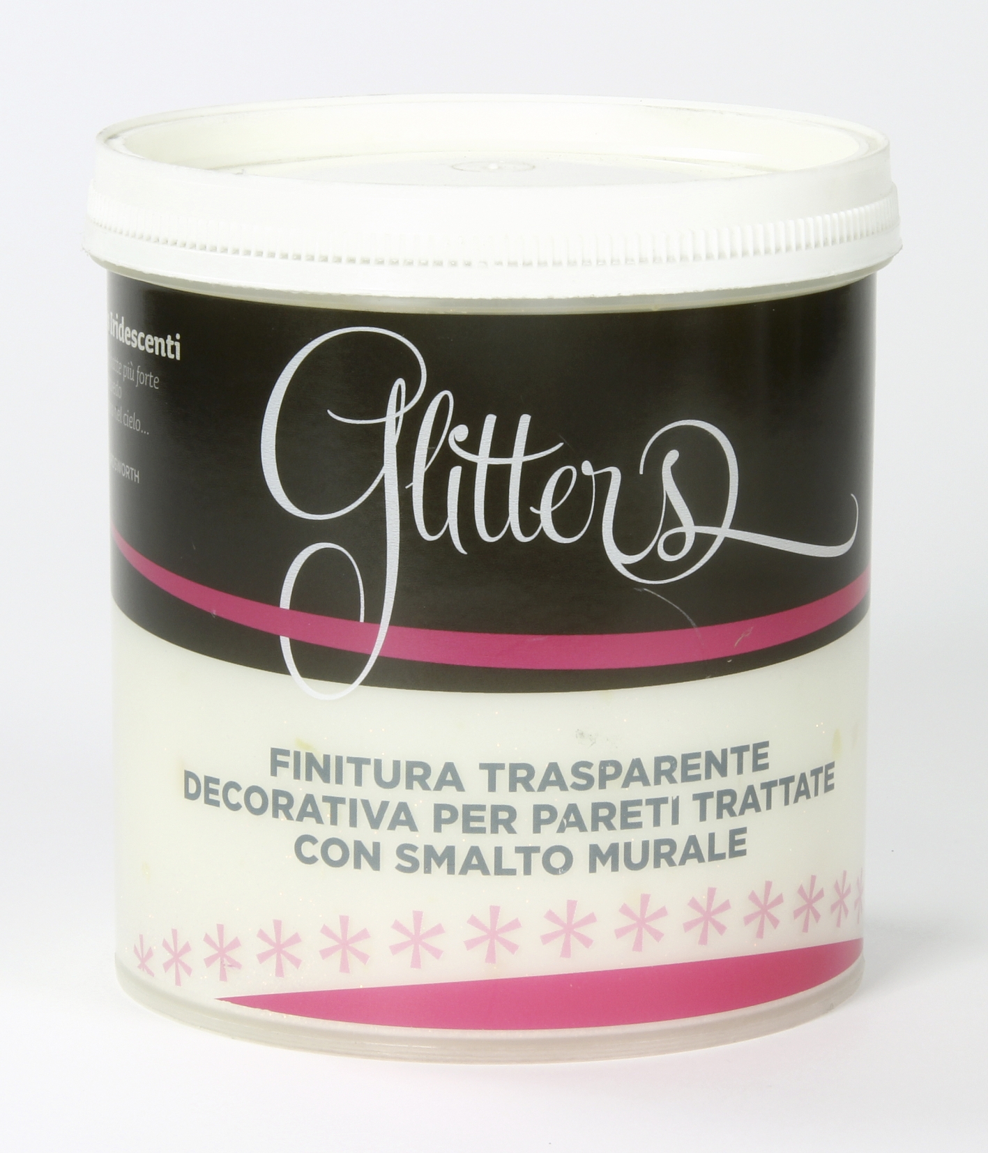Smalto all'acqua inodore, lavabile per interno, ad effetto iridescente trasparente.