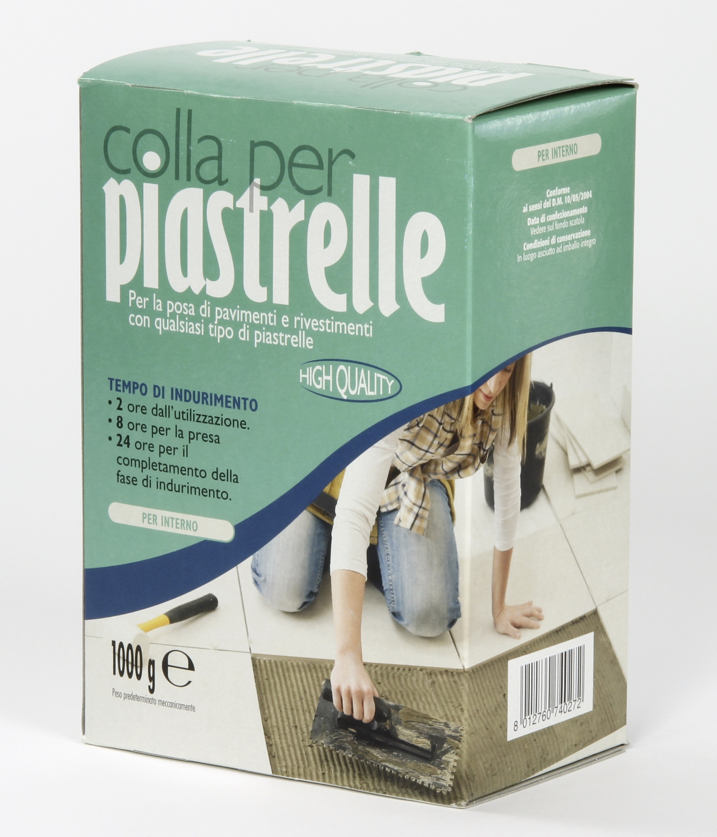 Colla piastrelle is a premixed white coloured powder, composed of: Portland cement, selected sands and specific additives to improve the workability and physical-mechanical properties. The product complies with the UNI EN 12004 standard and is classified as C1 NPD, "not suitable for outdoor use".