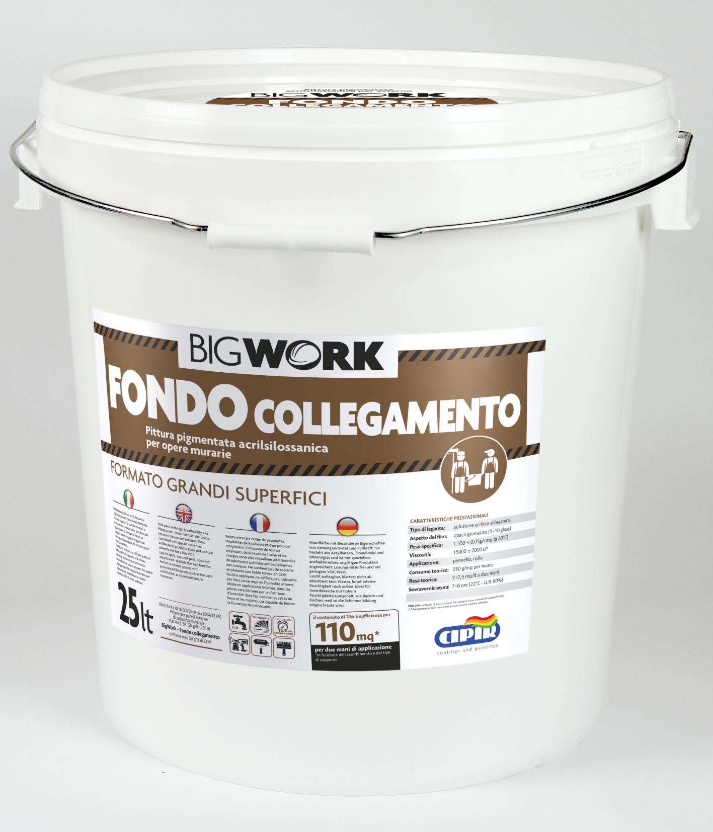 CYCLE: On new walls: make sure the surface is completely dry, clean and dust-free. New surfaces must be left to mature for at least 4 weeks. Apply the first coat. After at least 6-8 hours drying in normal environmental conditions, you can apply a second coat of BigWork - Fondo collegamento. On pre-painted surfaces: clean the surface thoroughly, remove old peeling paint, fill imperfections. Apply the first coat in diluted form as per the instructions. After at least 6-8 hours drying in normal environmental conditions, you can apply a second coat.