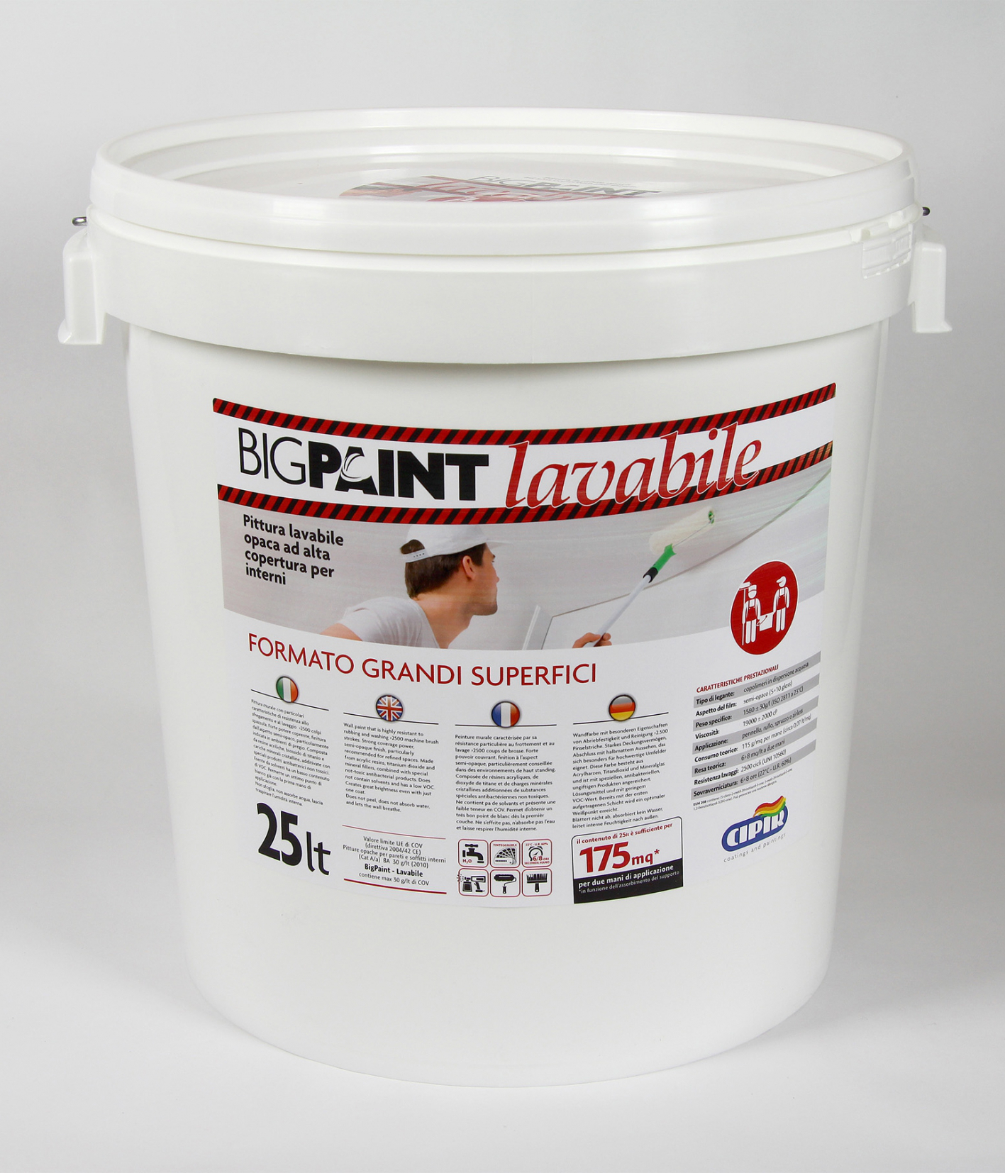 CICLO: Su supporti nuovi: accertarsi che l'intonaco sia stagionato da almeno 28 giorni in condizioni ambientali di temperatura ed umidità relativa normali. Controllare che la superficie sia perfettamente asciutta e pulita, quindi applicare una mano di fissativo "LACCA 140W". Trascorse almeno 8 ore si potrà applicare la prima mano di BigPaint- Lavabile. Dopo almeno altre 24 ore si procederà con la seconda passata di prodotto.