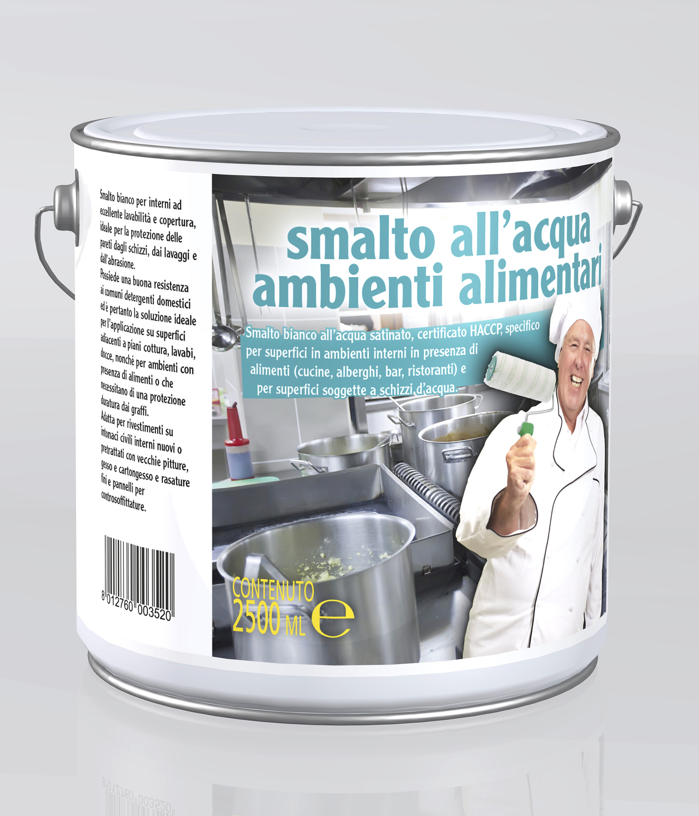 Satin-finished white enamel, HACCP certified, specifically for indoor surfaces in presence of food (kitchens, hotels, bars, restaurants) and for surfaces subject to splashing water.
