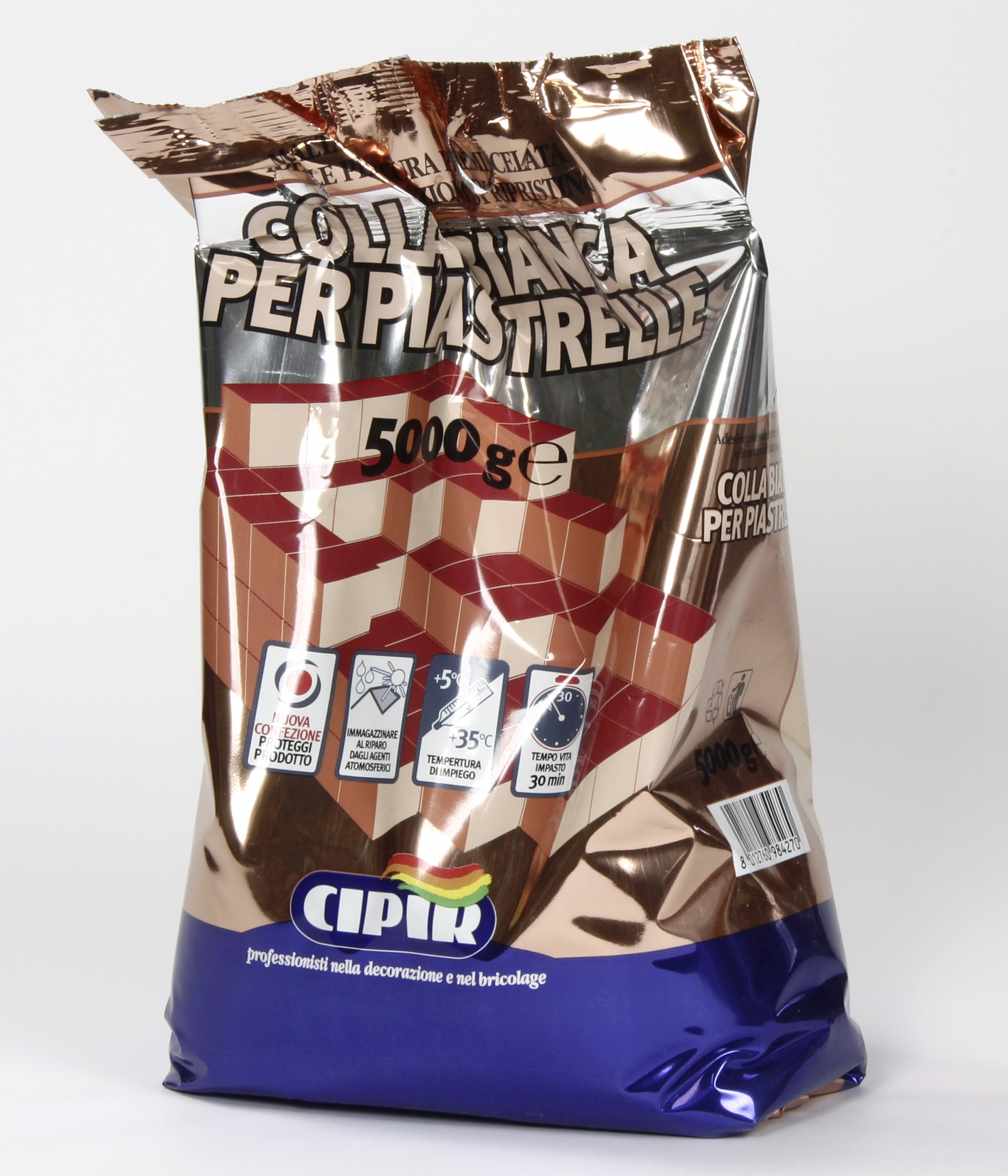 Colla piastrelle in sacchetto is a premixed white coloured powder, composed of: Portland cement, selected sands and specific additives to improve the workability and physical-mechanical properties. The product complies with the UNI EN 12004 standard and is classified as C1 NPD, "not suitable for outdoor use".