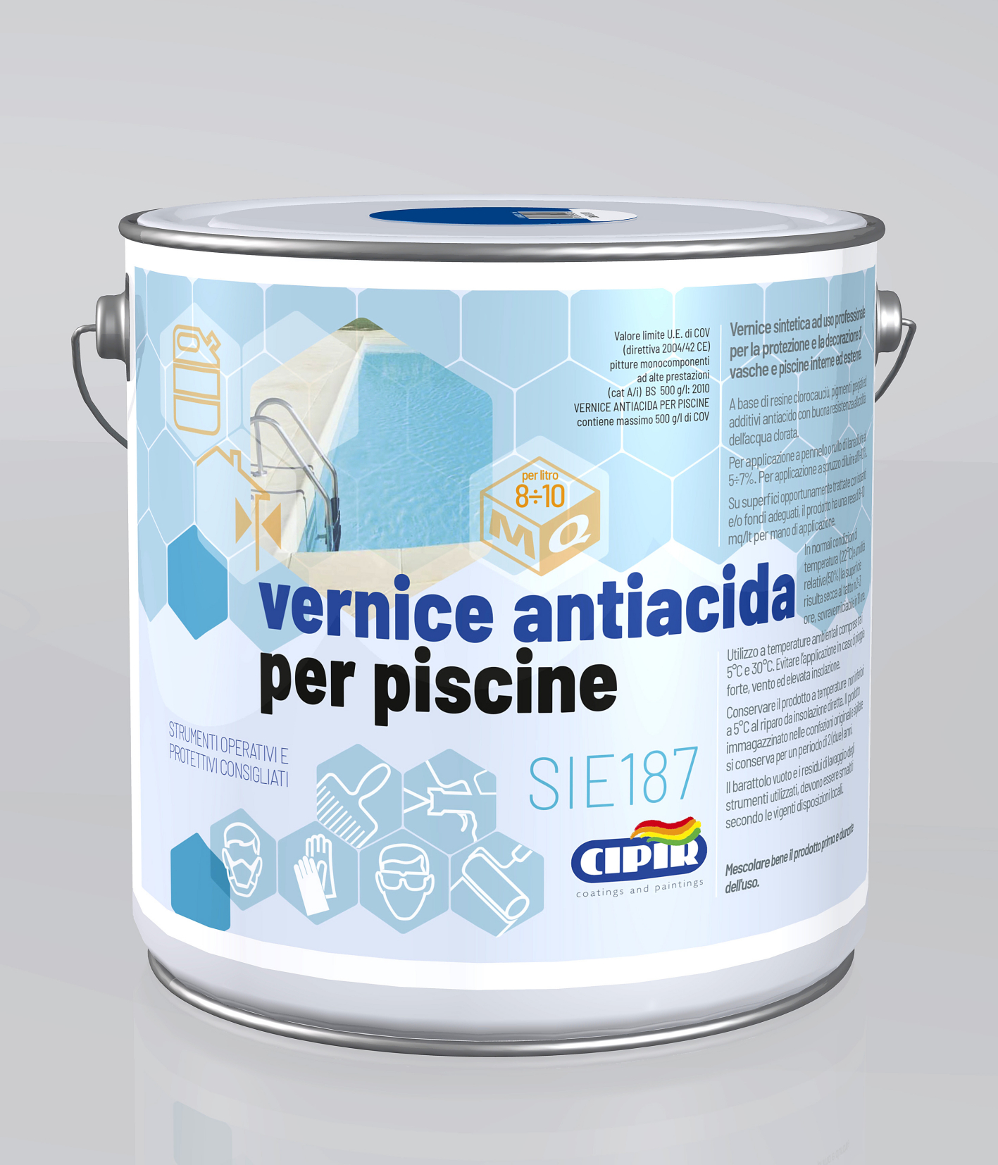CYCLE: On new substrates: make sure the substrate is perfectly dry, clean and dusted. Apply a coat of the product, thinned with about 10% of nitro thinner. After at least 8 hours, apply the second coat of Vernice antiacida per piscine thinned with about 2% of nitro thinner. If it is considered necessary for aesthetic reasons or to enhance the roughness of the base, apply a third coat of the product after 8 hours.