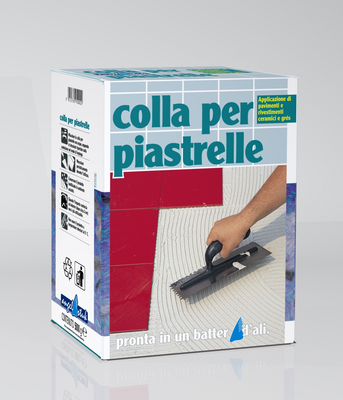 Colla per piastrelle is a premixed white coloured powder, composed of: Portland cement, selected sands and specific additives to improve the workability and physical-mechanical properties. The product complies with the UNI EN 12004 standard and is classified as C1 NPD, "not suitable for outdoor use".