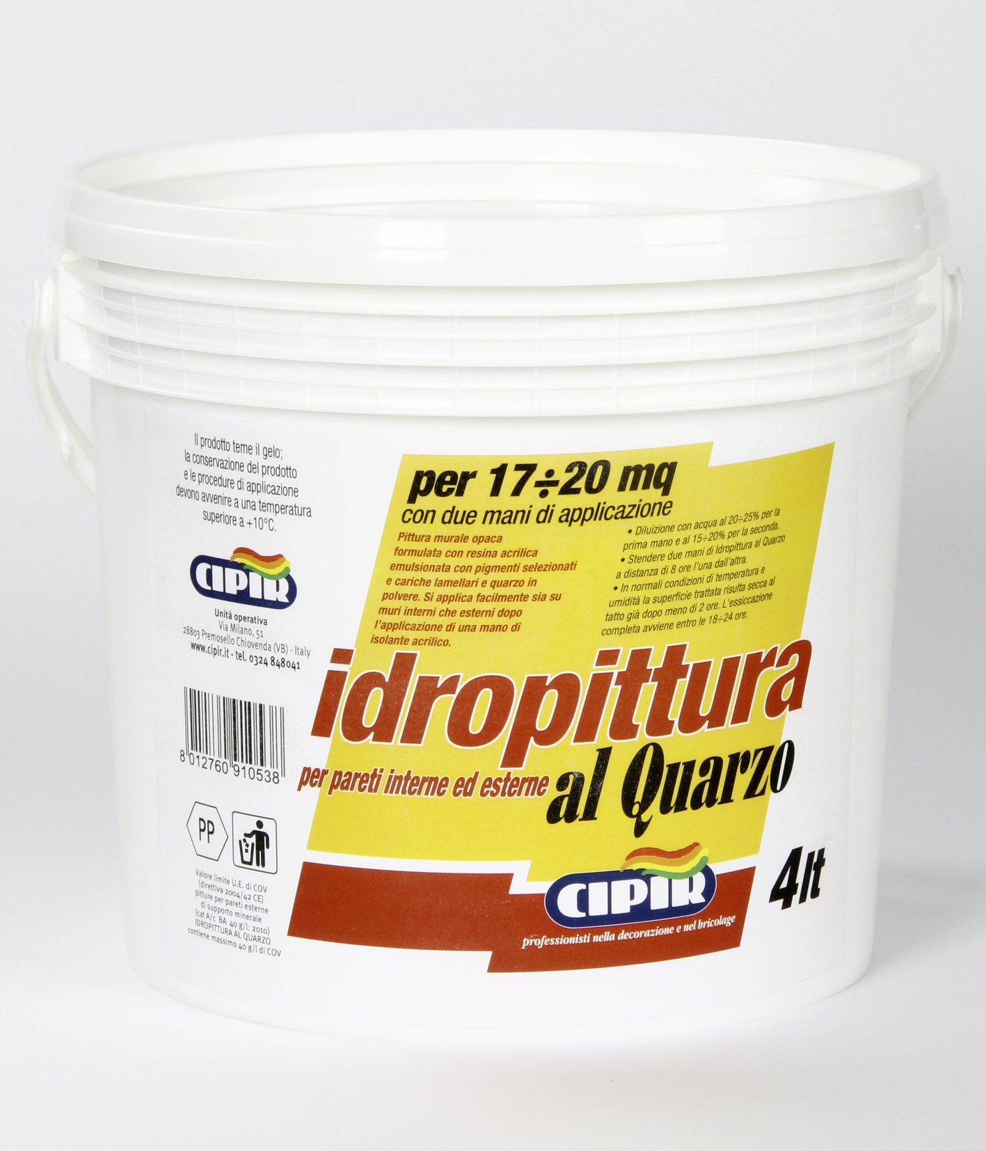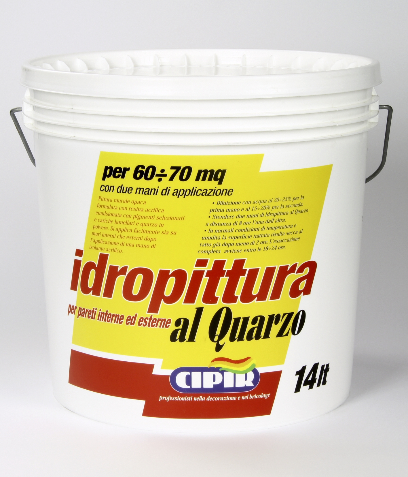 CICLO: Su supporto nuovo: accertarsi che l'intonaco abbia raggiunto la stagionatura di almeno 28 giorni, controllare che la superficie sia asciutta, pulita senza la presenza di polvere o parti poco consistenti. Applicare quindi una mano di fissativo "FIXCIPIR" diluito con acqua nel rapporto max di 1 parte di prodotto e 5 parti di acqua, a seconda dell'assorbimento del muro. Lasciare trascorrere almeno 12÷18 ore quindi procedere con l'applicazione della prima mano di Idropittura al quarzo. Dopo almeno altre 24 ore applicare la seconda mano.