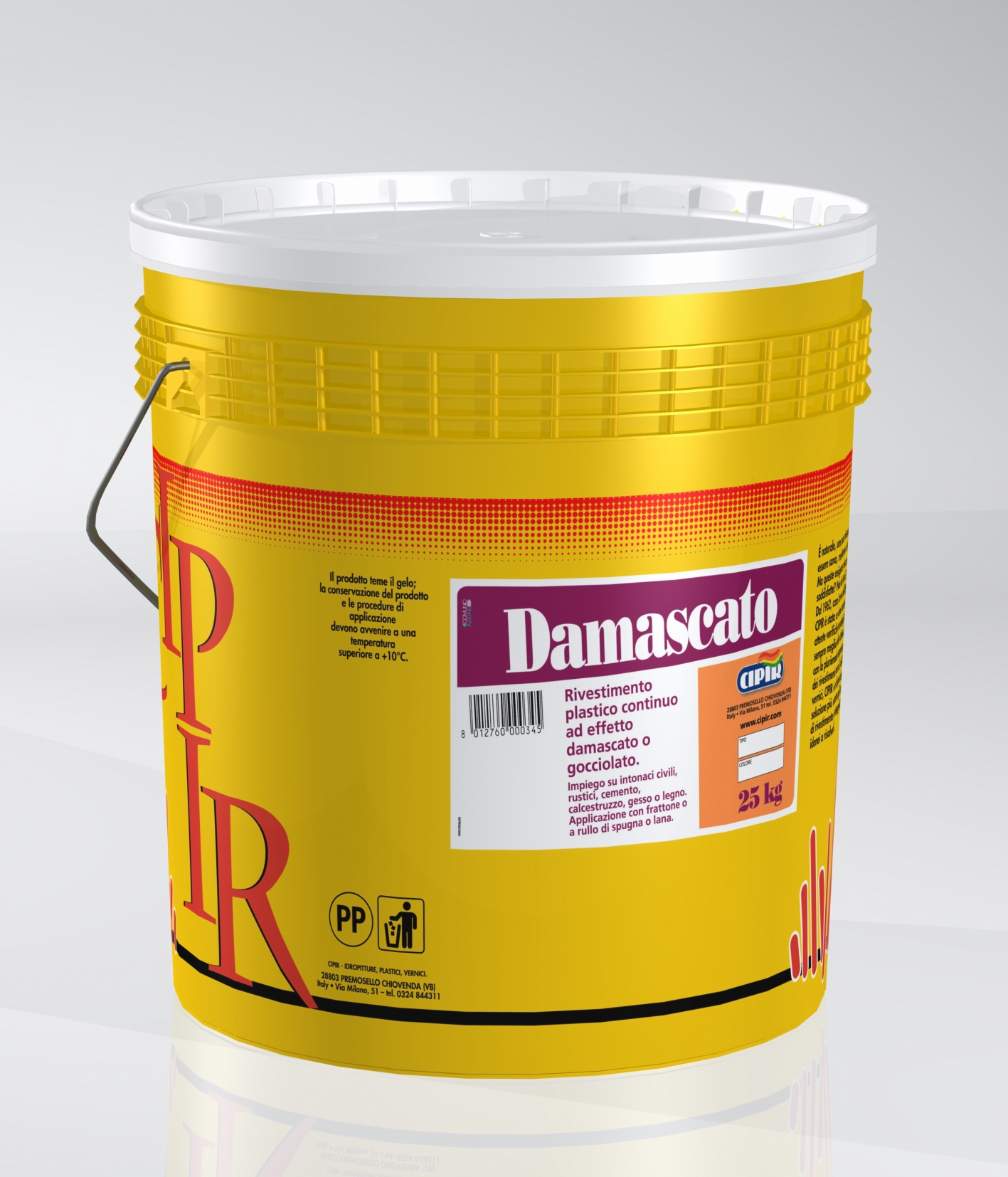 CICLO: Su supporto nuovo, accertarsi che l'intonaco abbia raggiunto la stagionatura di almeno 28 giorni, controllare che la superficie sia asciutta, pulita senza presenze di polvere o parti poco consistenti, applicare quindi una mano di fissativo all'acqua "FIXCIPIR" diluito con acqua nel rapporto max di 1 parte di prodotto con 5 parti di acqua. Lasciare trascorrere almeno 12÷18 ore quindi applicare il rivestimento Damascato.