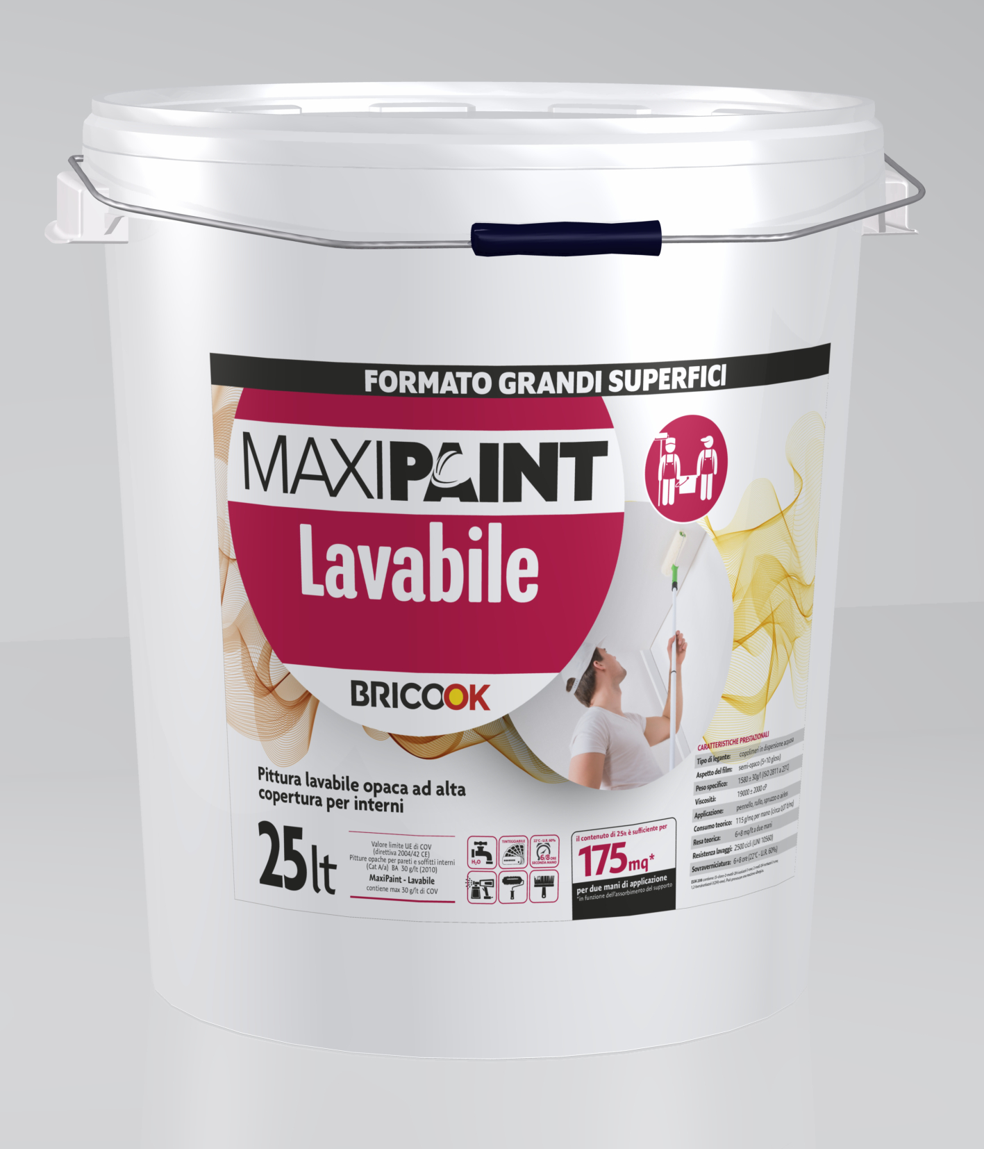 CICLO: Su supporti nuovi: accertarsi che l'intonaco sia stagionato da almeno 28 giorni in condizioni ambientali di temperatura ed umidità relativa normali. Controllare che la superficie sia perfettamente asciutta e pulita, quindi applicare una mano di fissativo . Trascorse almeno 8 ore si potrà applicare la prima mano di MaxiPaint - Lavabile. Dopo almeno altre 24 ore si procederà con la seconda passata di prodotto.