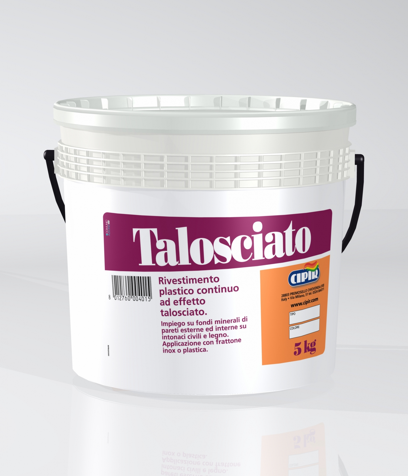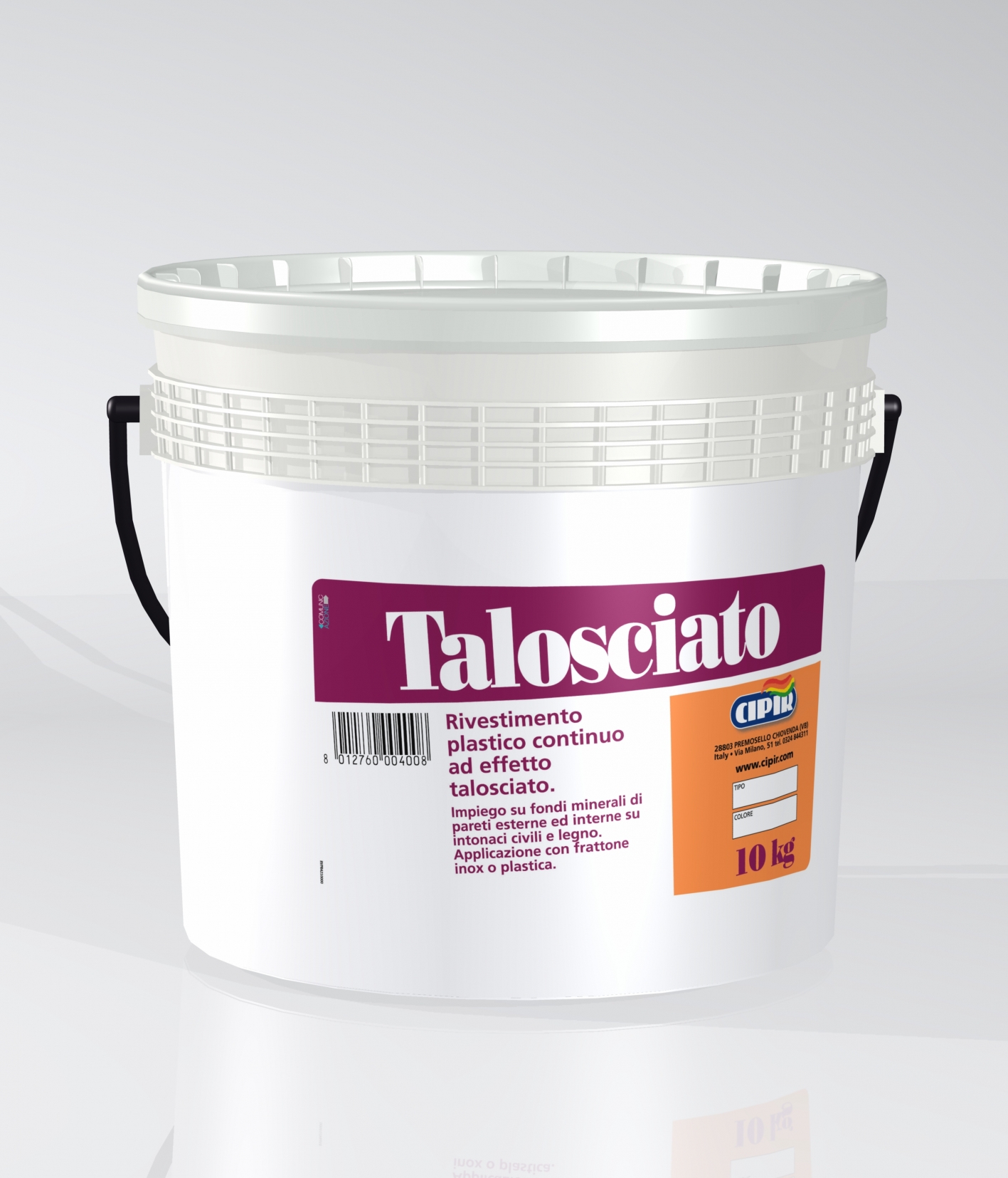 CICLO: Su supporto nuovo: accertarsi che l'intonaco abbia raggiunto la stagionatura di almeno 28 giorni, controllare che la superficie sia asciutta, pulita, senza la presenza di polvere o parti poco consistenti. Applicare quindi una mano di fissativo "FIXCIPIR" diluito con acqua nel rapporto max di 1 parte di prodotto in 5 parti di acqua. Lasciare trascorrere almeno 12÷18 ore quindi applicare il rivestimento Talosciato.