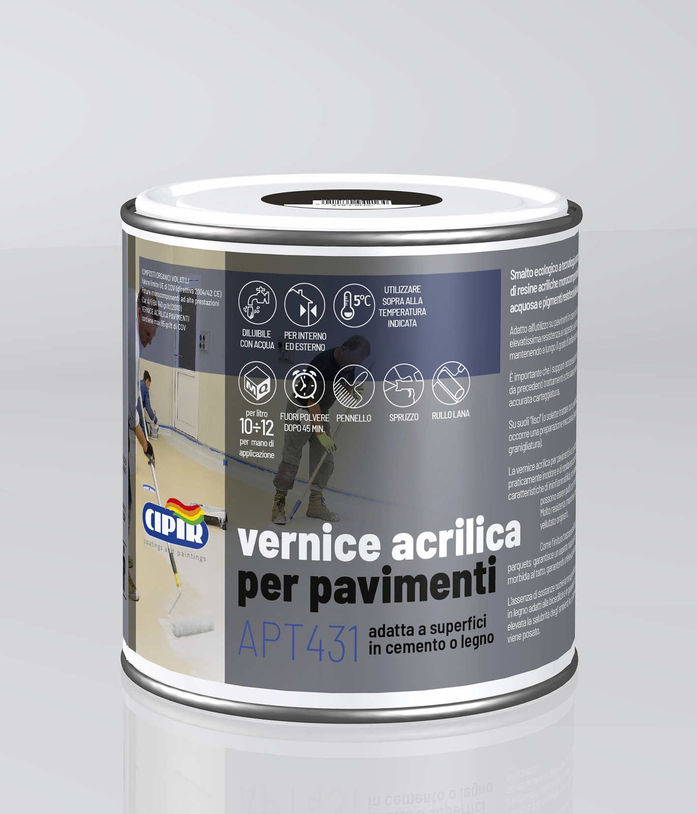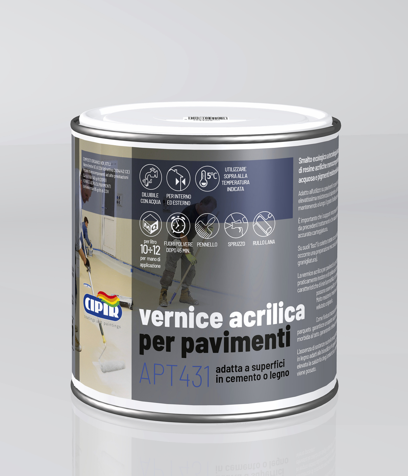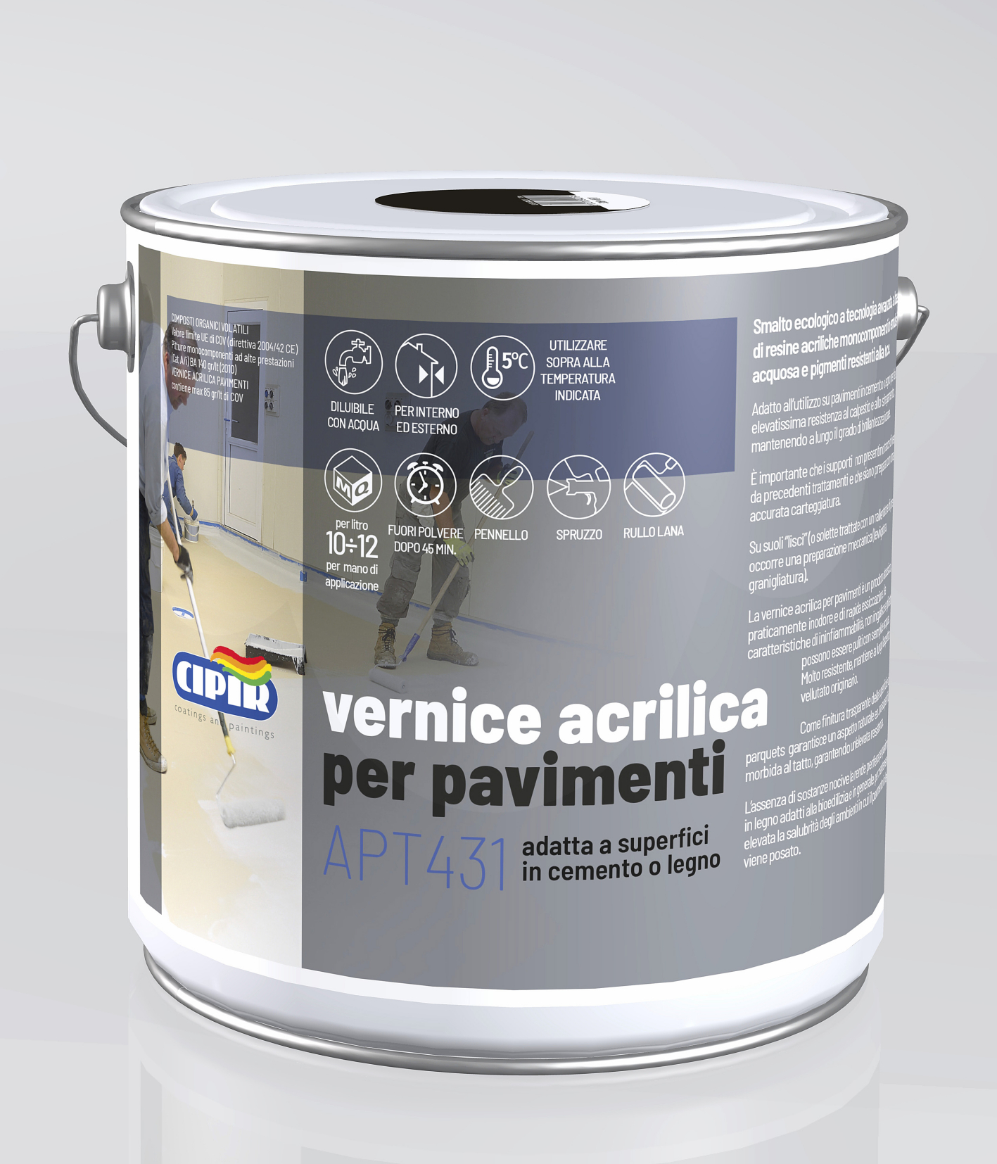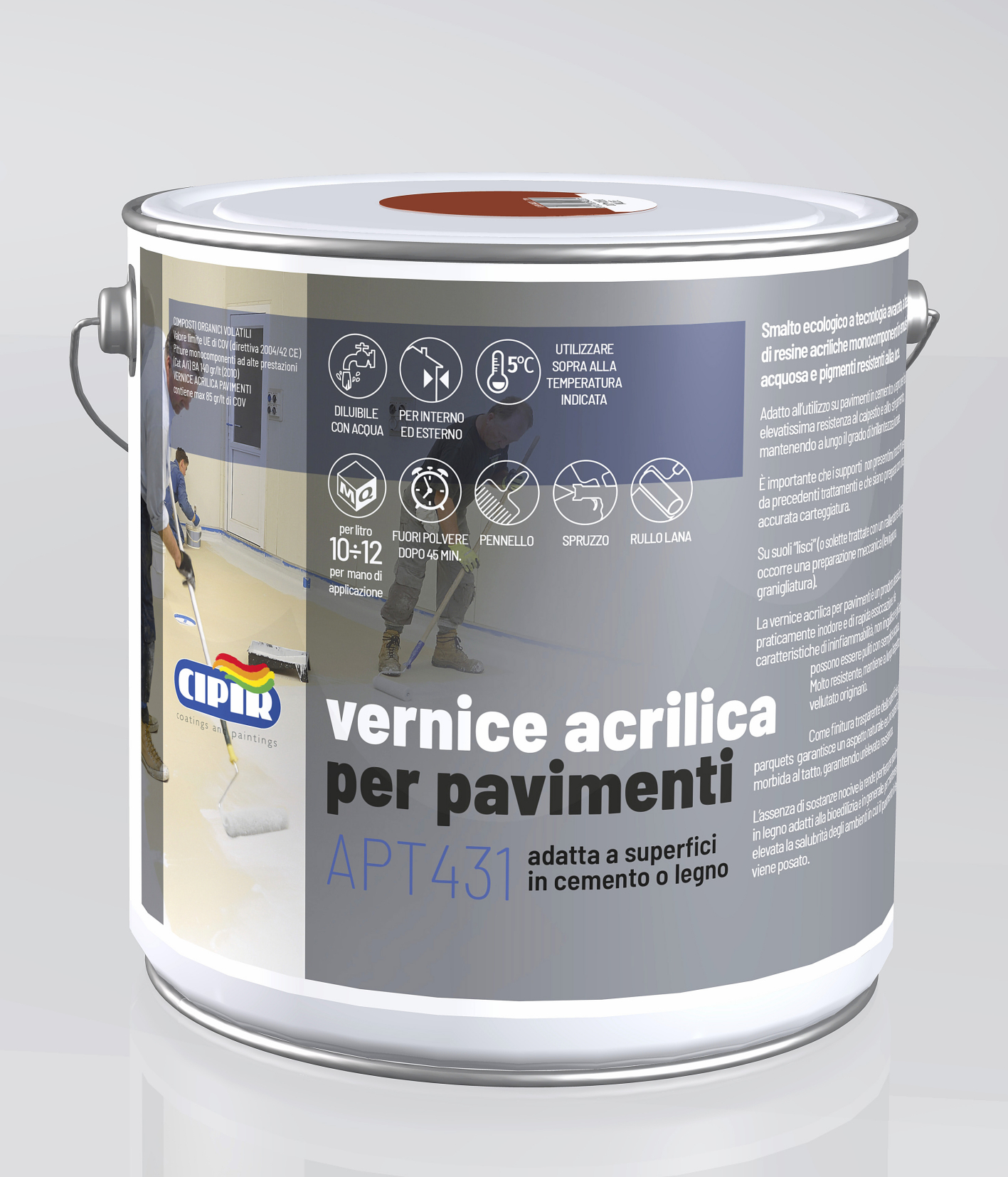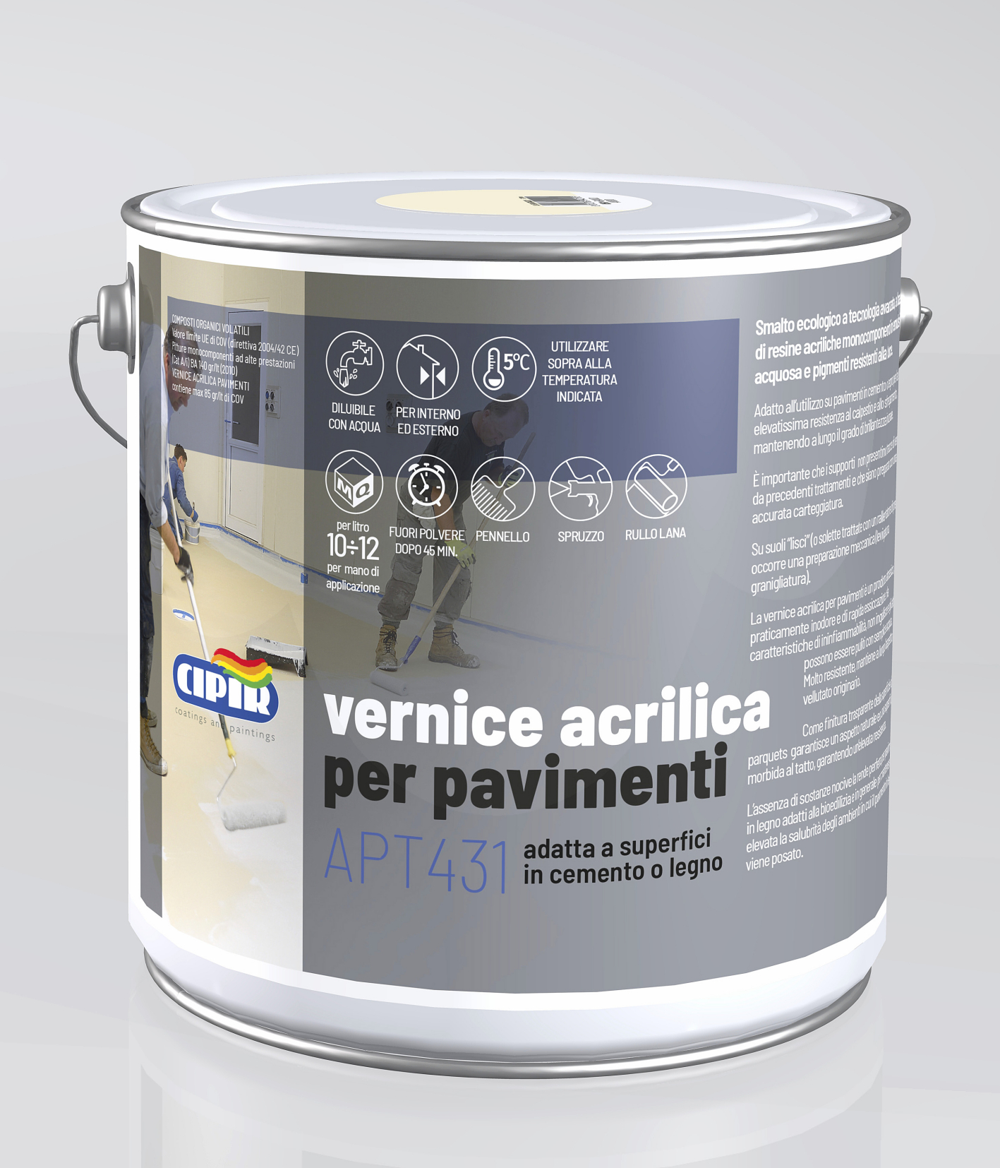 Vernice acrilica per pavimenti è un prodotto atossico, praticamente inodore e di rapida essiccazione. Ha caratteristiche di ininfiammabilità, non ingiallisce e gli attrezzi possono essere puliti con semplice acqua. Molto resistente, mantiene a lungo un aspetto vellutato.