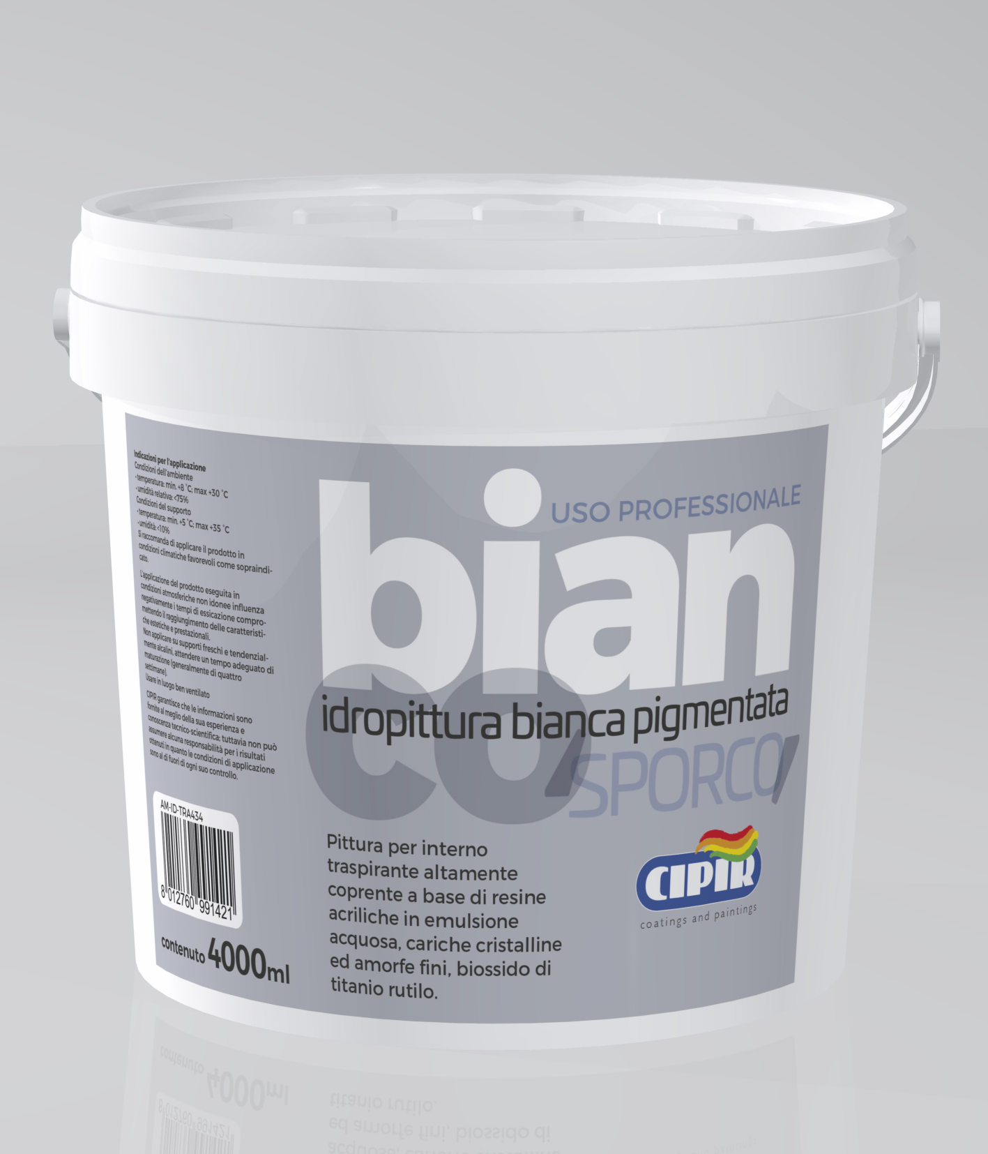 Pittura per interno traspirante a base di resine acriliche in emulsione acquosa, cariche cristalline ed amorfe fini, biossido di titanio rutilo e componenti antibatterici.