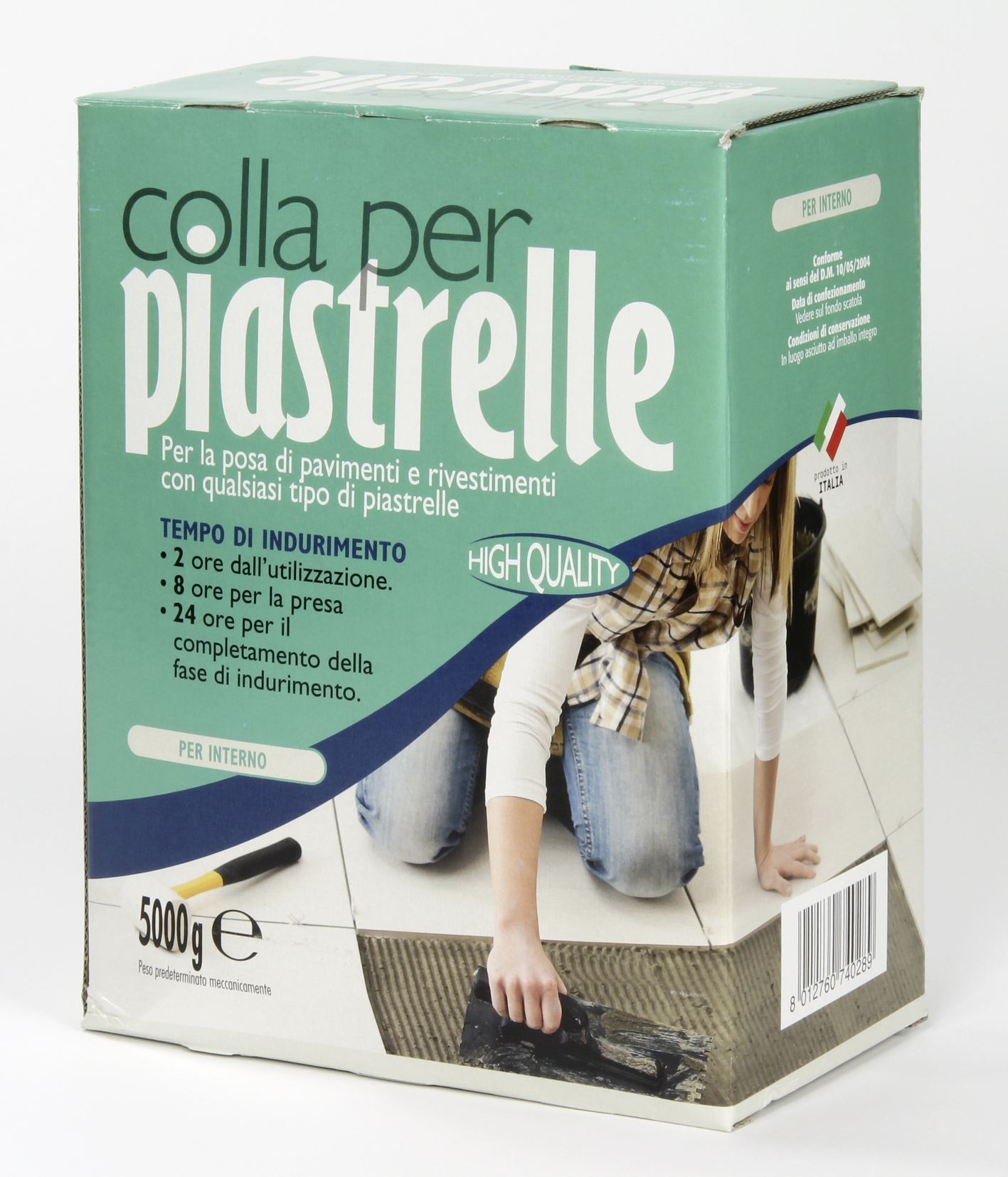 Colla piastrelle è un premiscelato in polvere di colore bianco composto da: cemento portland, sabbie selezionate e specifici additivi atti a migliorare la lavorabilità e le caratteristiche fisico-meccaniche. Il prodotto è conforme alla norma UNI EN 12004 ed è classificato come C1 NPD, "non adatto per usi esterni".
