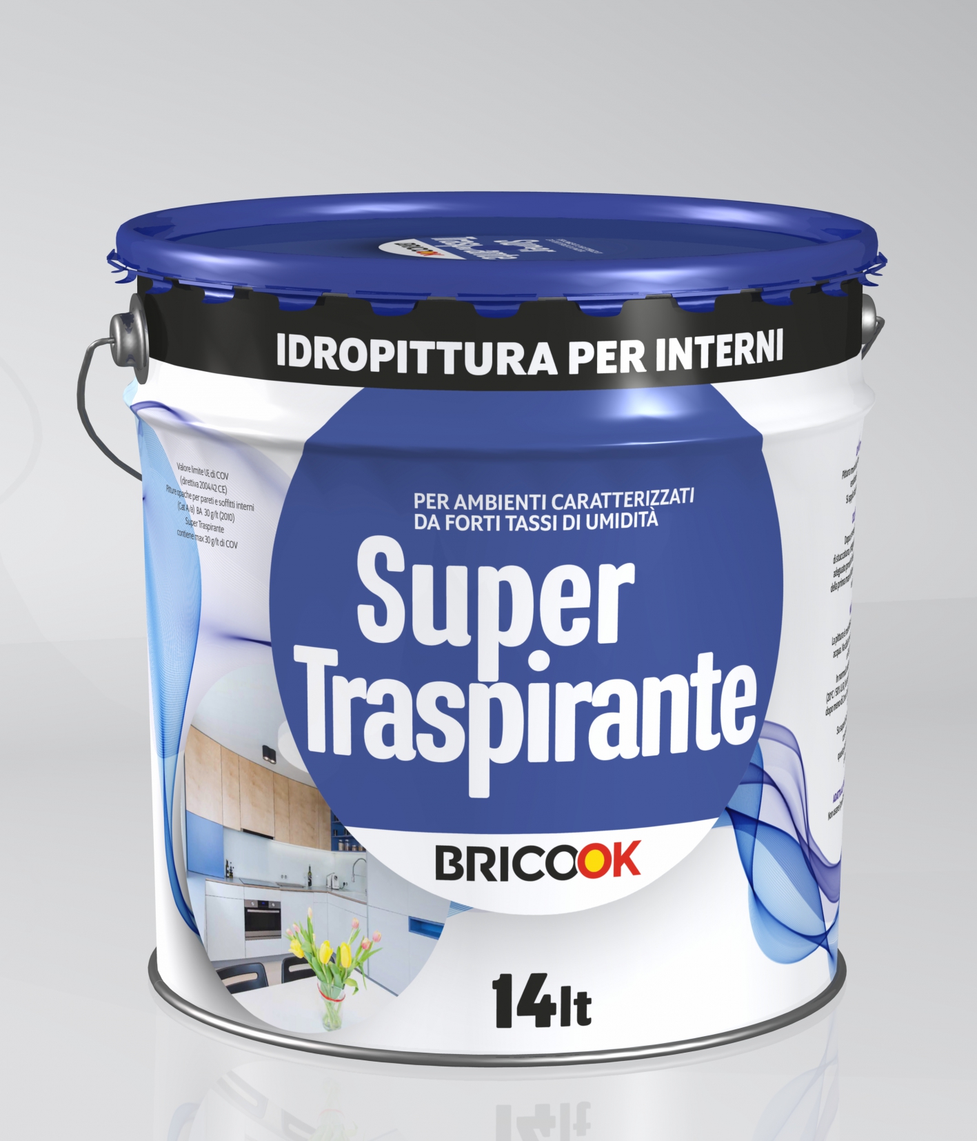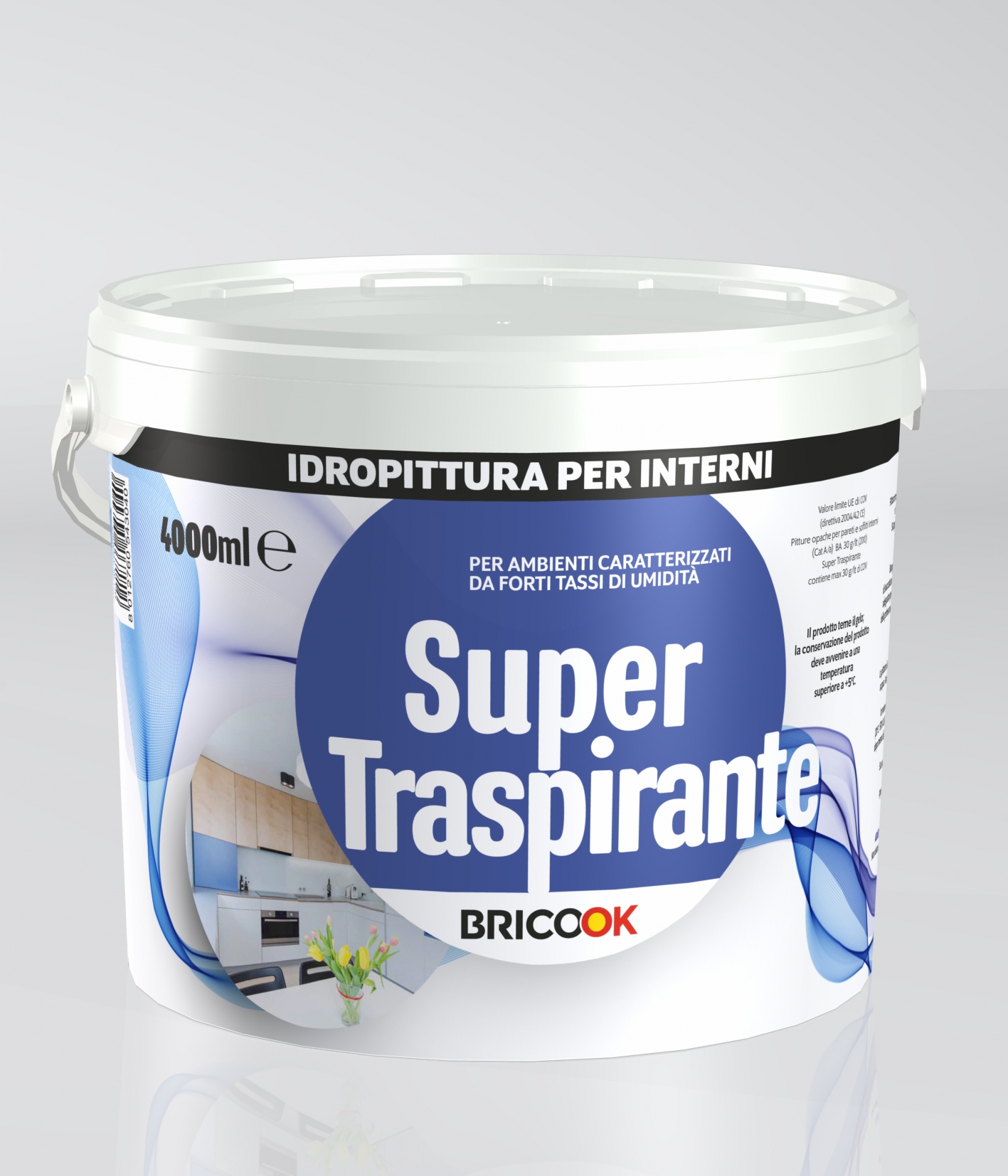 Pittura per interno traspirante a base di resine acriliche in emulsione acquosa, cariche cristalline ed amorfe fini, biossido di titanio rutilo e componenti antibatterici.