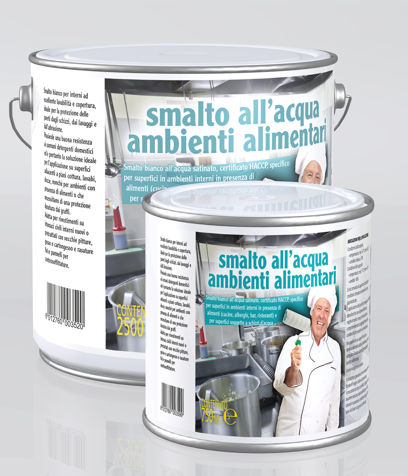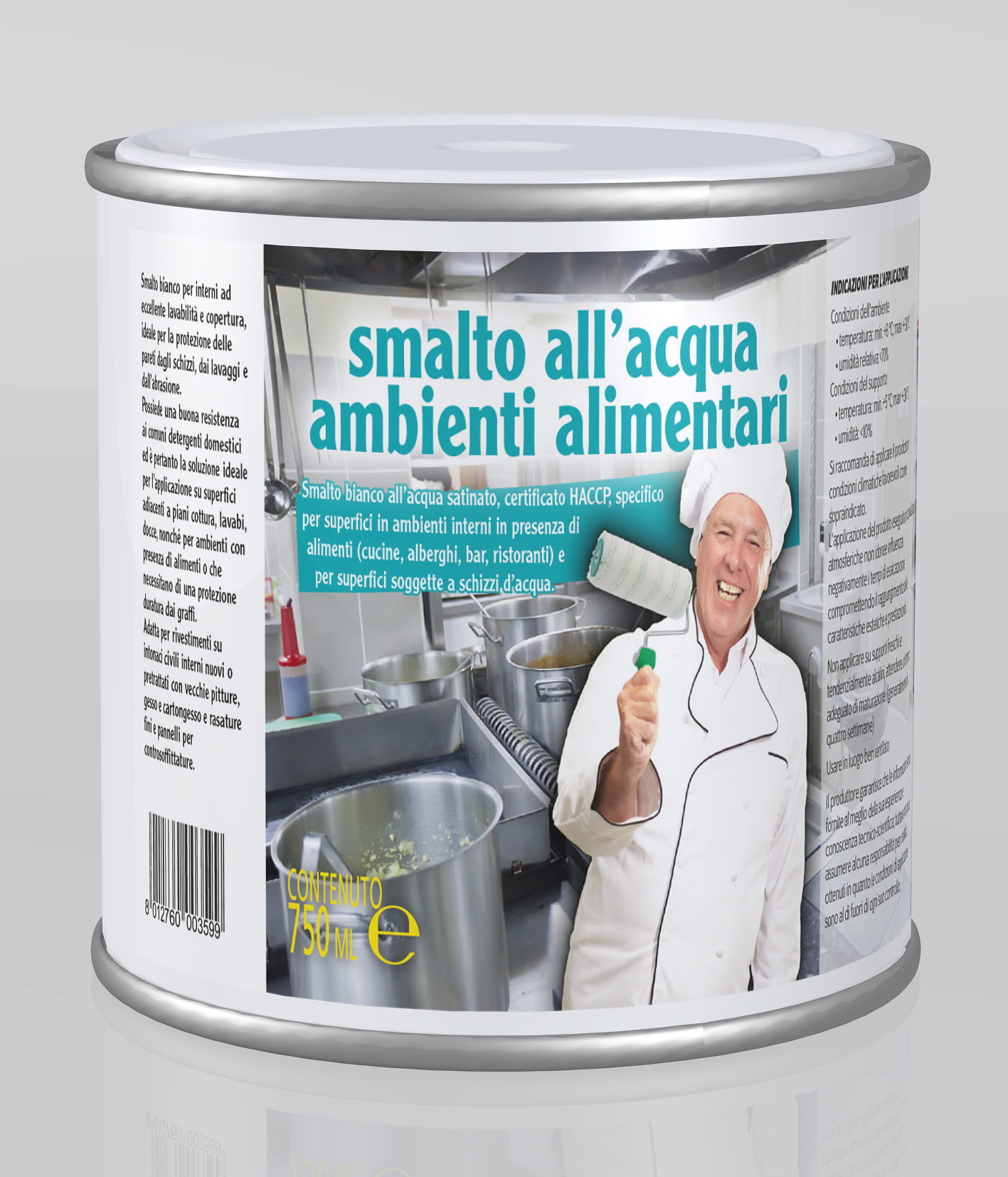 Smalto bianco all’acqua satinato, certificato HACCP, specifico per superfici in ambienti interni in presenza di alimenti (cucine, alberghi, bar, ristoranti) e per superfici soggette a schizzi d’acqua.