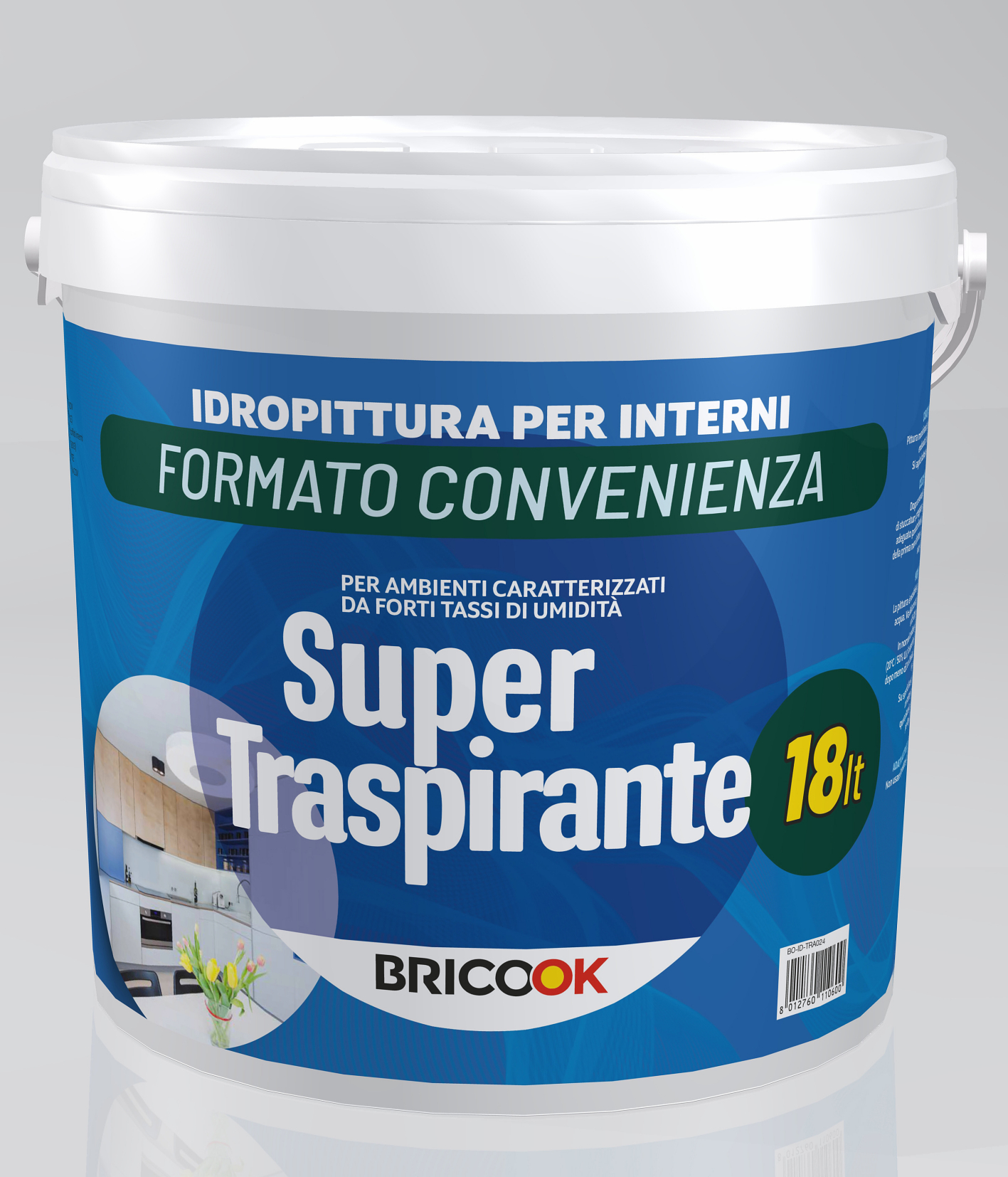 Pittura per interno traspirante a base di resine acriliche in emulsione acquosa, cariche cristalline ed amorfe fini, biossido di titanio rutilo e componenti antibatterici.